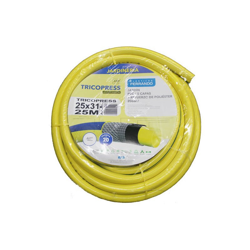 Manguera de PVC de cinco capas, con refuerzo textil tricotado en poliester de alta tenacidad, antitorsión (AMR) que le confiere mayor resistencia y flexibilidad.